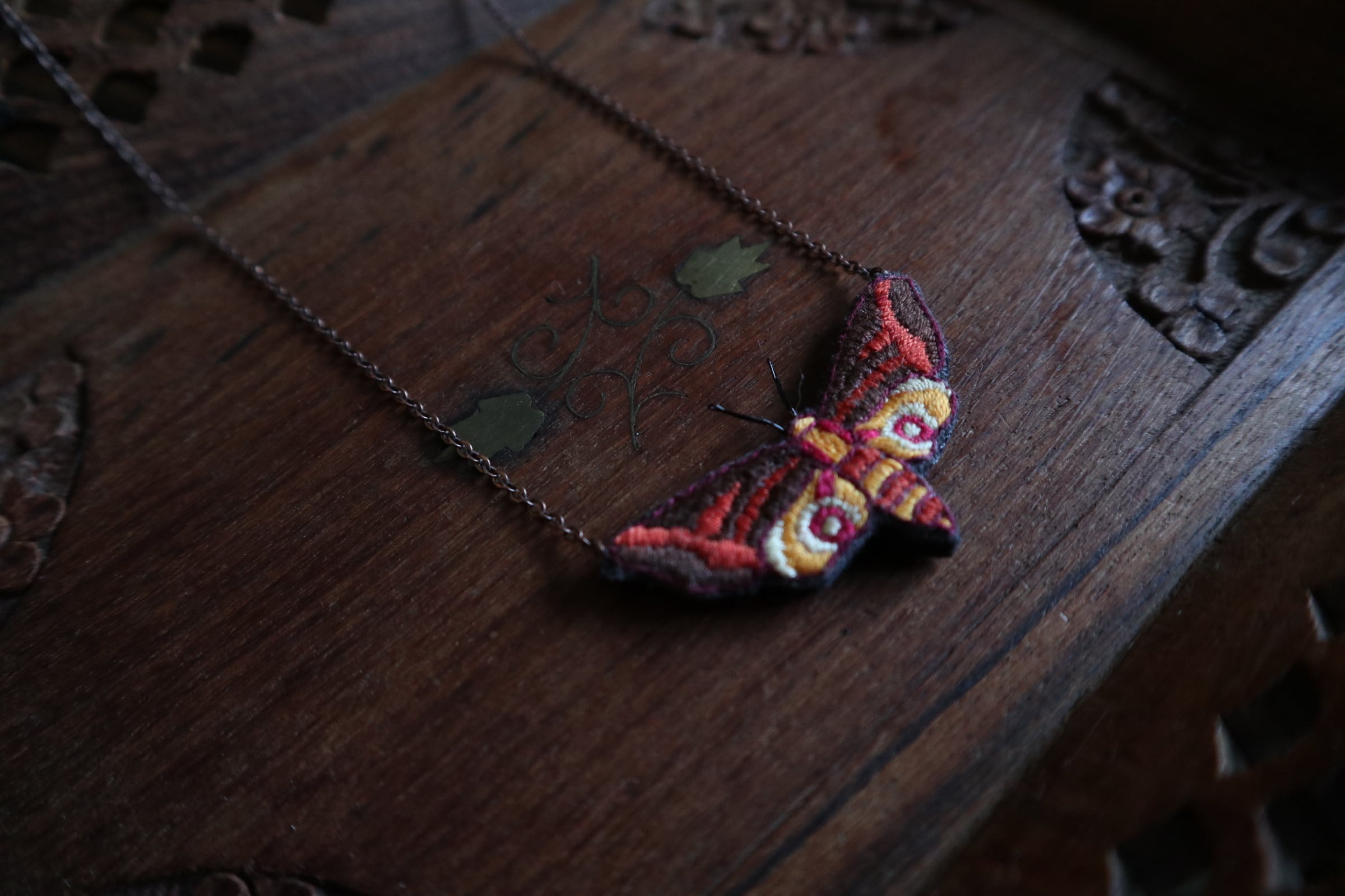 蛾のモチーフ刺繍ネックレスです。